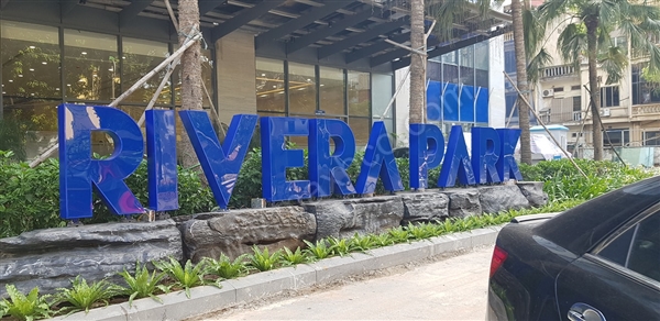 Bộ chữ RIVERA PARK được lắp đặt tại trước cửa ra vào của tòa nhà